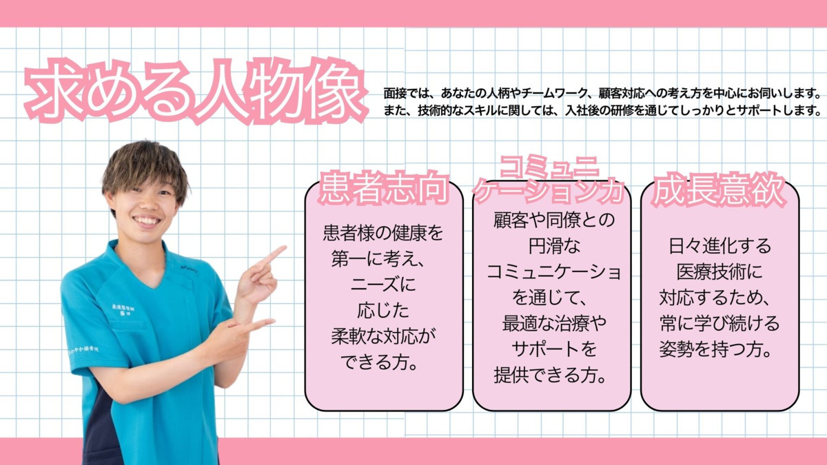 [1] ジョブメドレーの応募フォームよりご連絡ください ↓ [2] 採用担当より院内見学の調整などの連絡をさせていただきます ↓ [3] 院内見学・施術体験の実施 ↓ [4] 選考希望の確認 ↓ [5] 選考面接実施 ↓ [6] 採用決定のご連絡 ↓ [7] 入職手続きを進めてください ※見学も可能ですので、まずはジョブメドレーよりご応募いただき、お問い合わせください(治療体験も可)。 ※応募から内定までは平均1週間~1ヶ月ほどになります。 ※在職中で今すぐ転職が難しい方も調整のご相談が可能です。