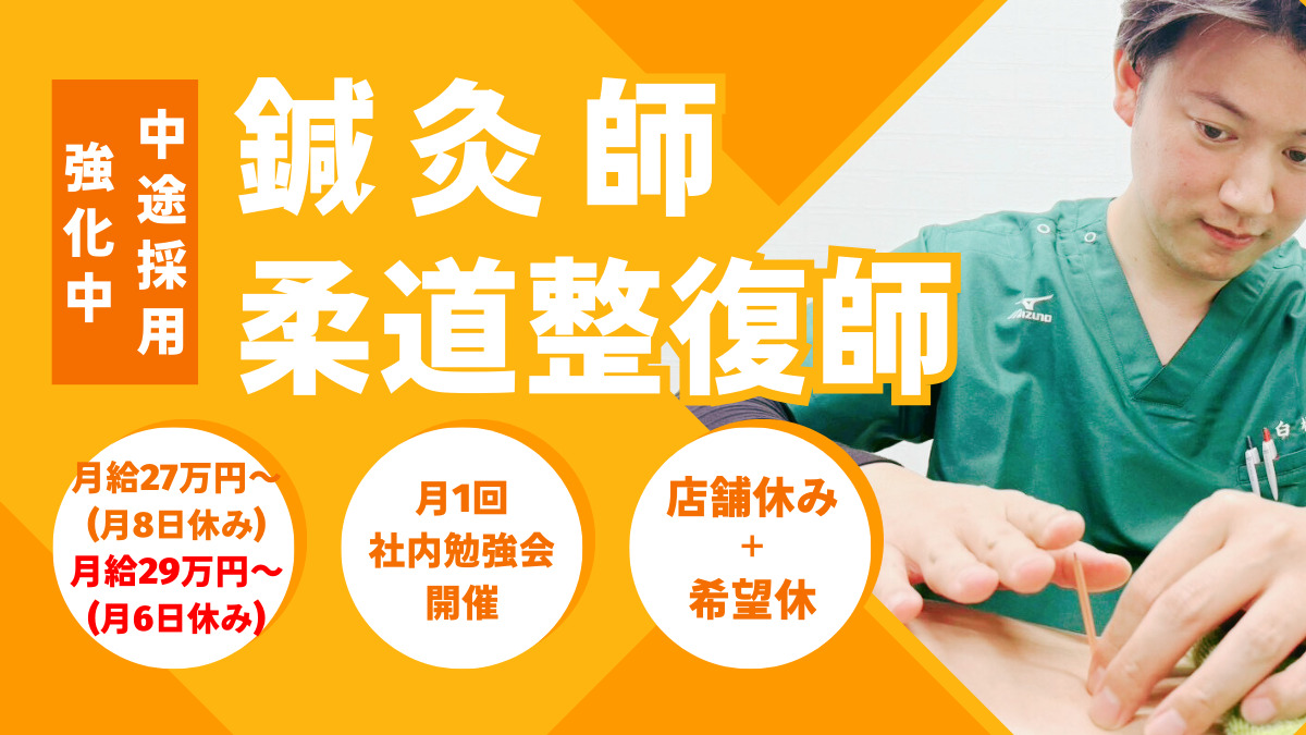 鍼治療、灸治療がメインになります。 それ以外にもスポーツ障害、テーピング施術 骨盤、骨格、猫背、O脚矯正 保険診療からの患者様一人、一人に合わせた自由診療を提供しています。 トレーナー活動(年一回北九州マラソンボランティアトレーナー参加、学生部活動帯同トレーナー活動) ハイボルト、トムソンベッド、EMSを駆使した新しい治療提供 データ分析をしながら細かい数字まで進捗し将来を見据えた運営法、保険請求勉強会、提携弁護士による交通事故勉強会をしています。 -- 業務内容の変更の範囲:会社指定する業務 就業場所の変更の範囲:会社の指定する事業所