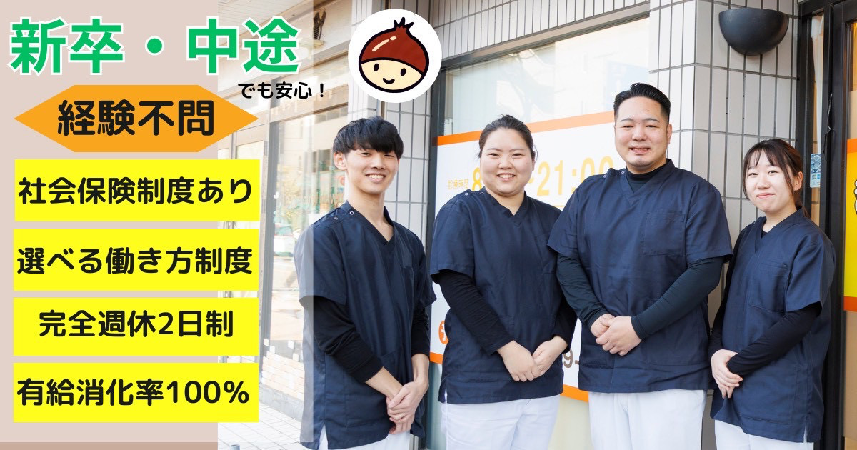 \私たちが一緒に働きたいのは、こんな方です!/ 現在の経験や技術レベルは問いません。まろんグループが一番大切にしているのは「素直さ」「明るさ」「元気の良さ」といった人柄です! ・明るく元気な挨拶ができ、素直な心で学べる方 ・チームワークを大切にし、仲間と一緒に成長を楽しめる方 ・本格的な治療はもちろん、美容鍼やエステにも興味がある方 ・将来は独立・開業したいなど、前向きな目標がある方 ・患者様に寄り添い、「ありがとう」と言われることに喜びを感じる方 一つでも当てはまるなら、あなたはまろんグループにピッタリです!見学からでも大歓迎ですので、ぜひご応募ください。