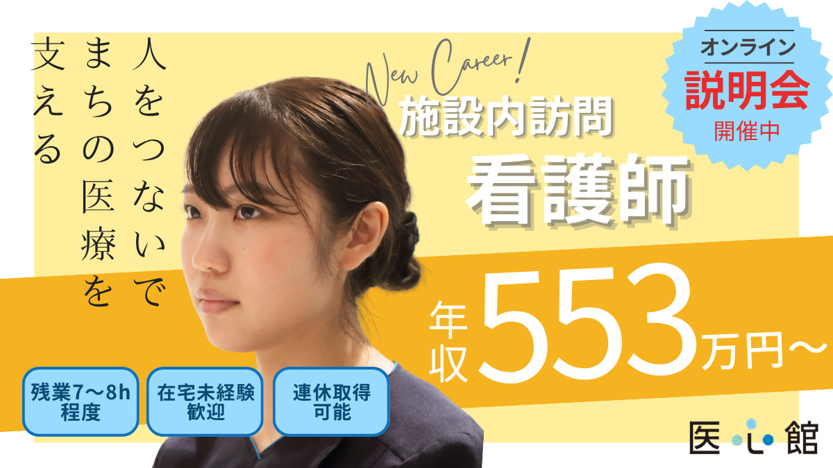 入居者様の生活・医療処置に併う看護ケア全般をお任せいたします。 💫 日勤:業務スケジュール 💫 * 8:30:朝礼 * 9:00:訪問看護のラウンド開始 * 11:30:訪問の合間に記録の記入 * 15:00:必要に応じて外部医師に報告 * 16:30:夜勤者への申し送り、見守り * 17:00:内服薬手配、食事介助、口腔ケア * 17:30:業務終了 ~~~~~~~~~~~~~~~~~~~~~~~~~~~~~~~~~~~~~~~~~ 💉 医心館看護の特徴 * 【訪問形式】病棟のラウンドに近い訪問スタイル(1訪問あたり30分を目安) * 【担当】日勤帯は10名ほどのご入居者様を担当 🚀 魅力ポイント * 残業少なめ:月あたり10時間未満です! * 安定したスケジュール:急な検査・手術がなく、予定が崩れにくい環境です! 🚨 医療連携体制(24時間安心) * ドクターは常駐していませんが、24時間365日電話対応が可能です! * 緊急時には往診体制あり、「土日の病棟」のような雰囲気です! 📌 詳細業務内容 ・バイタルサイン測定 ・フィジカルアセスメント ・感染予防、保清、介助等 ・医師の指示による医療処置 ・訪問診療時の医師対応 ・個別的なケア ・看護記録の記載 ☆配置人数(満床時 80名想定)☆ 日勤:看護師9~10名、介護職10~11名 夜勤:看護師5名、介護職3名