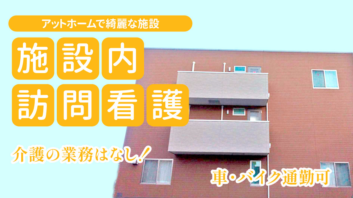■一般職 2023年6月OPENの高齢者施設内で施設内訪問看護業務をお任せします。 法人の他施設では20代~40代が活躍中の若手が活躍している環境です。 具体的な業務は下記となります。 ・経管栄養 ・吸引 ・点滴管理 ・血糖値測定 ・インスリン注射 ・褥瘡処置 ・電子カルテ入力などの看護ケア ・看護日誌の記入など ※残業ほぼなし ※基本的に介護業務はありません ■リーダー職 2023年6月OPENの訪問看護の主任(リーダー)として勤務していただきます。 その後のキャリアとして管理者を目指すこともできます! 今後、大阪府下でどんどん施設展開を考えているのでその中心で活躍いただきたいと思っています。 年収800万以上を目指せる管理職候補の募集です。 社内独立も可能です! 法人の他施設では20代~40代が活躍中。若手が活躍している勢いのある職場環境です。 具体的な業務は下記となります。 ・経管栄養 ・吸引 ・点滴管理 ・血糖値測定 ・インスリン注射 ・褥瘡処置 ・電子カルテ入力などの看護ケア ・看護日誌の記入 など ※基本的に介護業務はありません。 ※お看取りやターミナルや末期の癌など医療行為の必要な方が多いです。 ※施設への訪問です。
