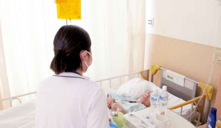 医師の指示の確認後、点滴の実施や患者さんに合わせた清潔ケアを実施します。 清潔ケアは看護補助者も一緒に行います。