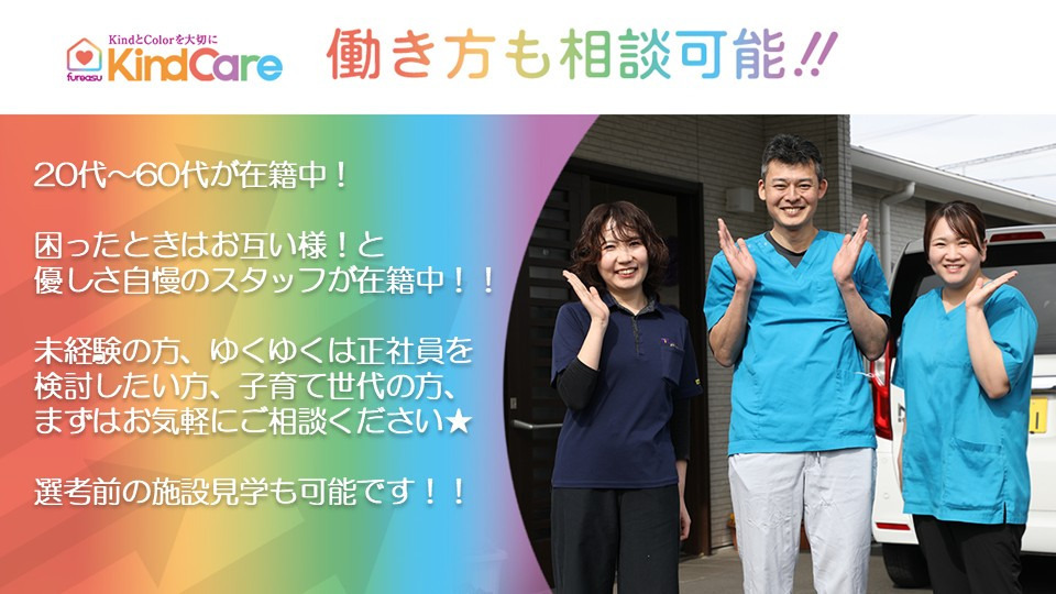 看護小規模多機能って業界でもマイナーな介護サービスだと思います。 「なかなか働くイメージがわからない…」という方、多いのではないでしょうか?? 面接等で実際の働き方や、かんたきの良いところ大変なところ・フレアスの福利厚生の改善したいところもお伝えしています。笑 働き方・残業時間なども包み隠さずお答えしますので、気になる部分はなんでも聞いていただきたいです! 『社員の物心の幸せを追求する』という経営理念のもと、年間休日や手当を増やせないかと試行錯誤しています。笑 難しいことは置いておいて、寄り添った介護・看護がしたい方、ぜひご応募お待ちしております!! 施設見学や会社説明会も応募フォームからお問い合わせください★