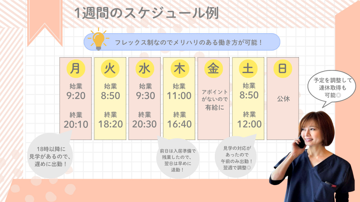 週休2日(シフト制) 月9日(10日の月もあり) 年間休日:115日(夏季冬季休暇含む) ┏━━━━━━━━━━━━━━┓ 私たちが「フレックス」を 採用している理由 ┗━━━━━━━━━━━━━━┛ すべては、 「患者様とご家族のため」です。 手続きをお待たせしている間に ご逝去となってしまった…… そんな悲しい出来事を防ぐために、 ニーズに合わせて早めに動ける フレックス制度を導入しています。 私たちは、制度を最大限に活用し 一人でも多くの方に 安心の場所を届け続けます。 「間に合ってよかった」 その一言のために、私たちは動きます。 📢 実際のお休みの取り方 フレックス制度のイメージが つかない方は説明会で \分かりやすくご説明します!/
