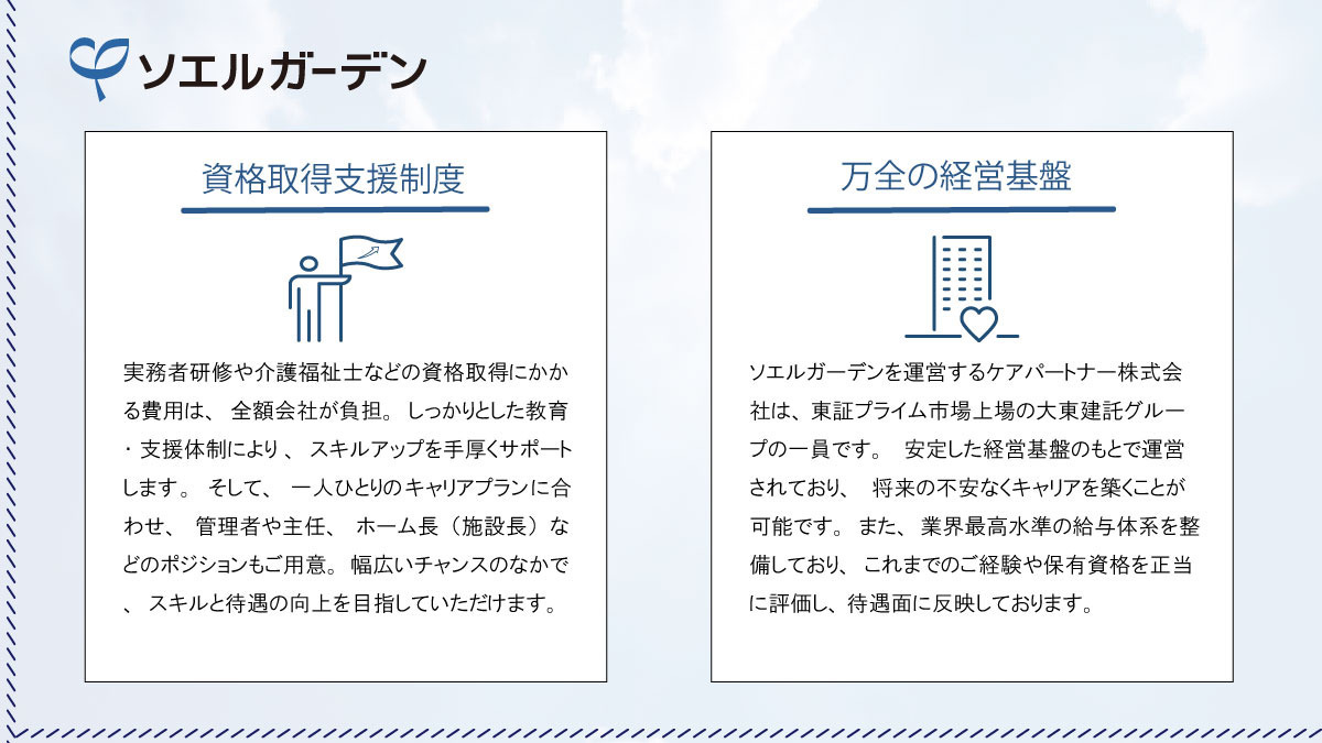 私たちケアパートナー株式会社は、大東建託グループの一員であり、介護サービス/看護サービス/保育サービス/障害者福祉事業などを全国で展開する企業です。