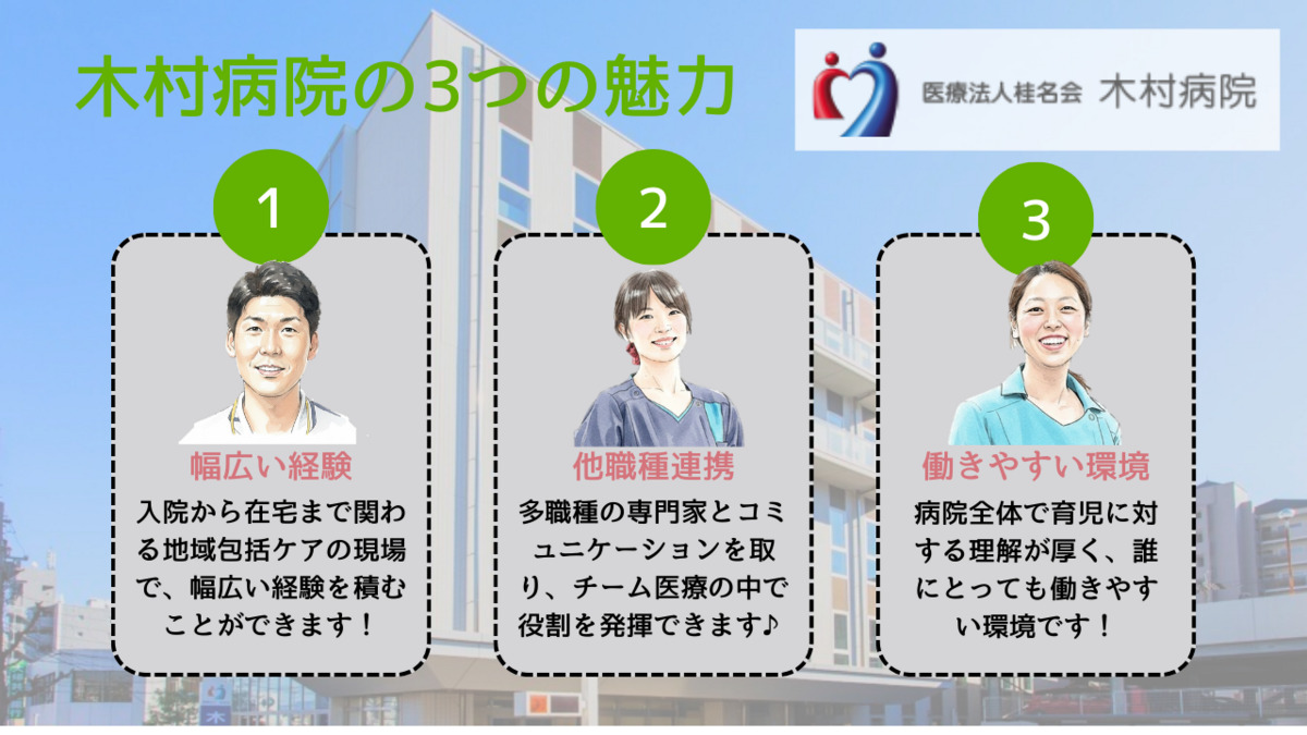 ・在宅復帰や退院支援に向けた各関係機関との連絡、交渉力を備えた方を歓迎します。