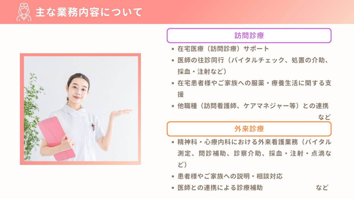 訪問診療 ・医師の往診同行(バイタルチェック、処置の介助、採血、注射など) ・在宅患者様やご家族への服薬、療養生活に関する支援 ・多職種(訪問看護師、ケアマネジャー等)との連携 ◎外来業務 ・精神科・心療内科における外来看護業務(バイタル測定、問診補助、診察介助、採血、注射、点滴など) ・患者様やご家族への説明、相談対応 ・医師との連◎携による診療補助 ◎業務全般 ・電子カルテ入力、記録業務 ・院内感染防止対策、物品管理 ・カンファレンスやミーティングへの参加 ・新規スタッフや非常勤医師との情報共有、サポート