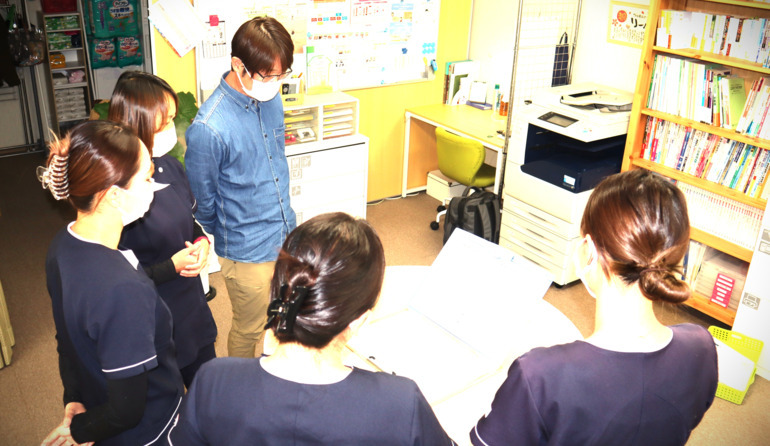 前日の訪問内容の報告を共有し、当日の訪問スケジュールの確認・必要な変更を行います。利用者様の最新情報をチームで申し送り、訪問に必要な備品や物品の準備・確認をしてから業務を開始します。