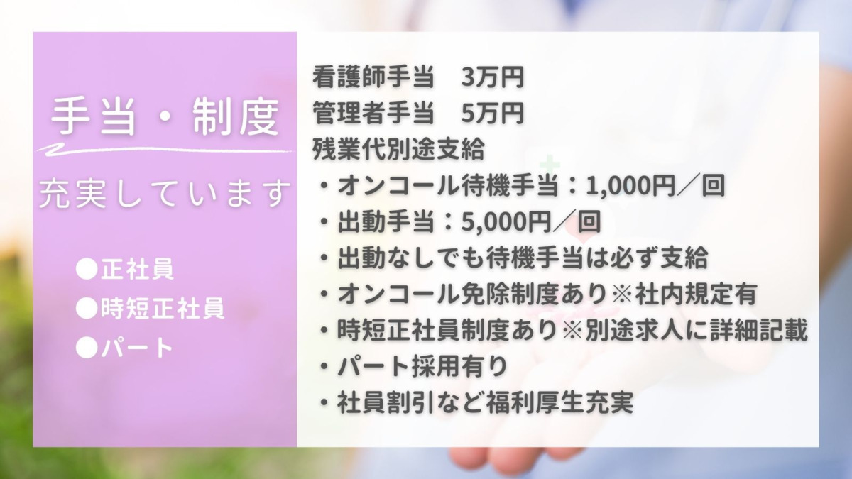◎常勤正社員 30~40万円(正看護師) 基本給 27万円 看護師手当 3万円 管理者手当 5万円 残業代は別途支給 ・オンコール待機手当:1,000円/回 ・オンコール対応手当:1,000円/回 ・出動手当:5,000円/回 ・出動なしでも待機手当は必ず支給 ・オンコール免除制度あり(管理者は免除なし・子育て・家庭事情の方は免除可能) ◎時短正社員 週30時間 基本給 20万円 看護師手当 3万円 残業代は別途支給(週40時間までは割増なし) ◎パート 時給1600円 変動労働時間制