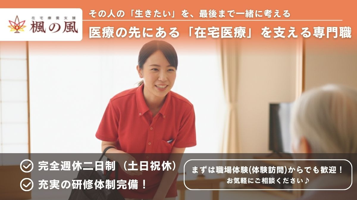在宅で暮らす方の“日常と医療のあいだ”を支えるため、 ご自宅や集合住宅へ訪問し、看護ケアと生活支援を行います。 常勤1名に対して専用車両とご自宅近くの駐車場を貸与。 社用車通勤が可能であるだけでなく、必要に応じて直行直帰ができ、オンコール時も負担が少ない体制を構築しています! ◆1日の業務の流れ(目安) ・1日 4~5件ほどの訪問 ・計画書・記録の作成(専用iPadを1人1台支給) ・必要に応じて 担当者会議・退院時カンファレンスへの参加 ・オンコール対応 ◆訪問時の主なケア内容 当社は“看取りに偏らず、あらゆる疾患・ライフステージに寄り添う”訪問看護が特徴です。 <状態観察> バイタルチェック、服薬状況確認、症状変化のアセスメント など <医療処置> 点滴、注射、血糖測定、吸引、褥瘡予防・処置、在宅酸素・人工呼吸器管理、 腹膜透析(CAPD)、その他医師の指示に基づく処置 <生活支援ケア> 清拭、手浴・足浴、排泄ケア、リハビリスタッフとの連携支援 など “深い対話を通じて、その人の望む生活を整えていく”点が楓の風のケアの核です。 ◆記録・ツール ・電子カルテ(iPad)を使用 ・使い方は入職時に丁寧にサポート ・クラーク配置のある拠点では事務作業の一部をサポートし、看護に集中できる環境を整えています。 ◆スタッフ体制(拠点により異なる) ・看護師:4~6名程度 ・リハビリ職(PT/OT/ST):若干名 ・医療事務(クラーク):若干名 ・所長・副所長・SVの伴走体制あり ◆研修・サポート体制(充実度が当社の強みです) 入社後は段階的に学べるプログラムを整備しています。 1.入社時研修(オンライン・集合研修) 楓の風の看護観、在宅看護の基礎、安全管理、記録、法律知識など 2.フォローアップ研修①(入社約2ヶ月) ケース検討、アセスメント強化、困りごとの個別相談 3.フォローアップ研修②(入社4~7ヶ月) 症例の振り返り、重症度の高いケースへのアプローチ、在宅ホスピスケアの理解 4.月次研修・ELNEC研修・SV同行 経験年数に応じて学べる仕組みあり ◆その他(法律上の記載) ・従事すべき業務の変更範囲:会社の定める業務 ・就業場所の変更範囲:会社の定める勤務地