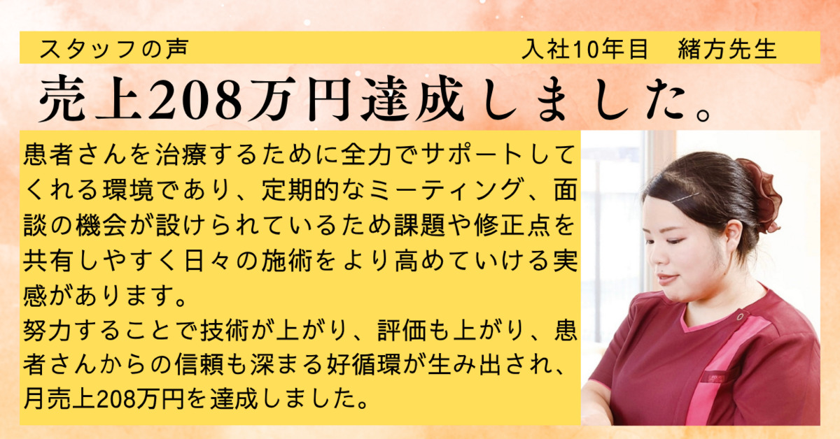 - 治療家一人ひとりが自分のもっている手技を十分に発揮できる環境です。