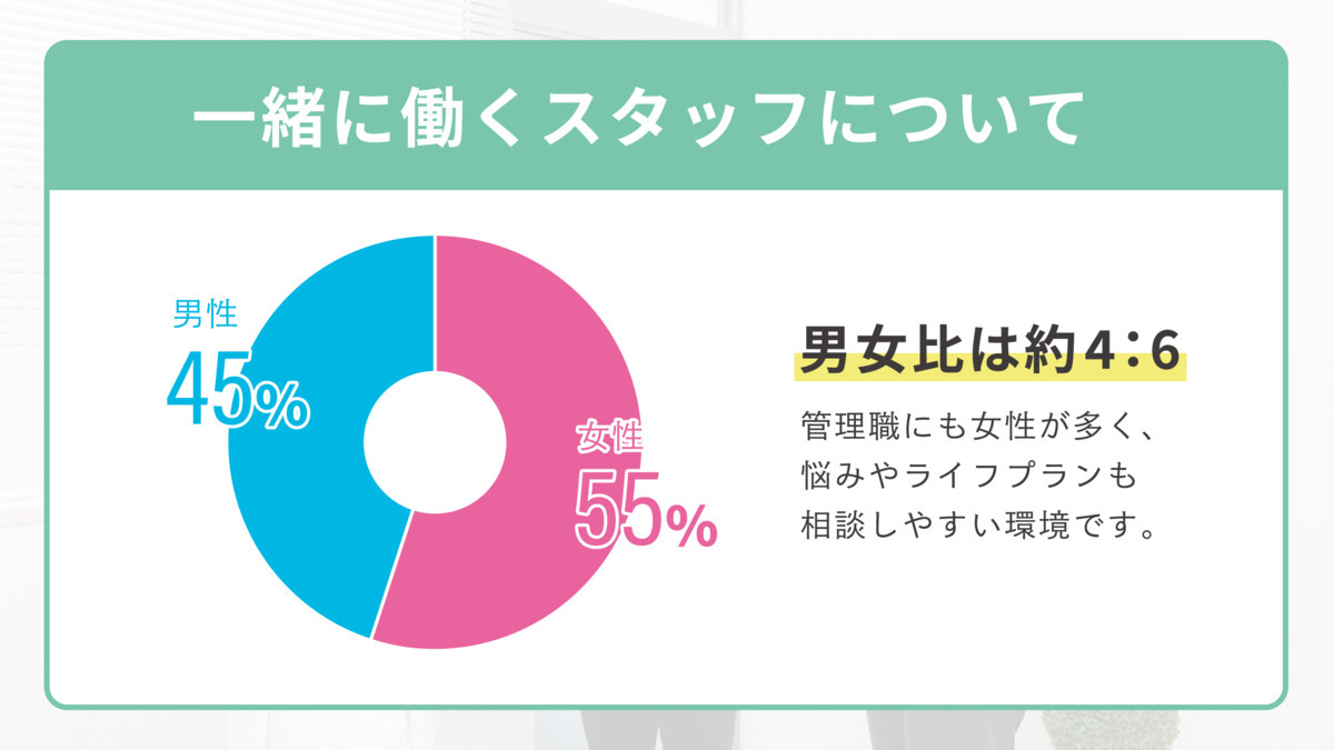 産休育休制度・時短制度取得実績あり 有給休暇・慶弔休暇・ブライダル休暇あり