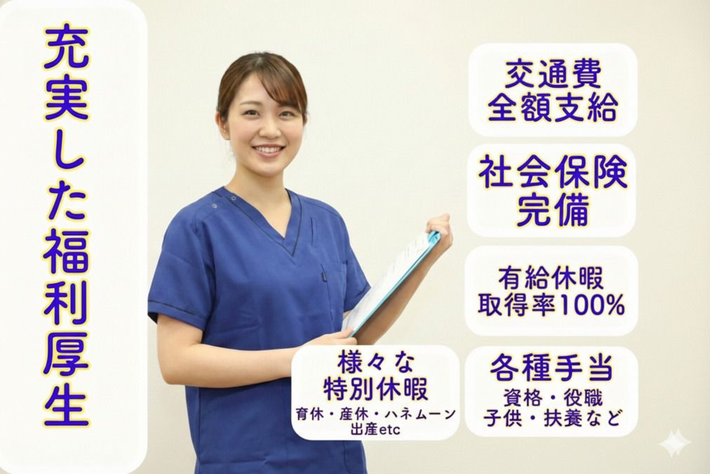 ・完全週休2日制 ・GW・夏季休暇・年末年始休暇 ・有給休暇取得率100% ・社会保険完備 ・制服貸与 ・自転車通勤ok(2キロ以上自転車手当有) ・社内社外研修&勉強会 ・社外勉強会費用負担有り ・一人暮らし昼食米代支給 ・産休・育休制度 ・ハネムーン休暇 ・独立開業支援(勉強会もあります) ・社内イベント(食事代など) ・健康診断(年1回) ・ワクチン接種補助