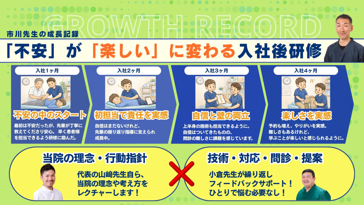 今回は患者さまを笑顔にする整体師を募集しています。整体師の資格の有無は問いません。人の話をじっくりと聞ける方、コミュニケーションを大切にできる方にぜひご活躍いただきたいです。