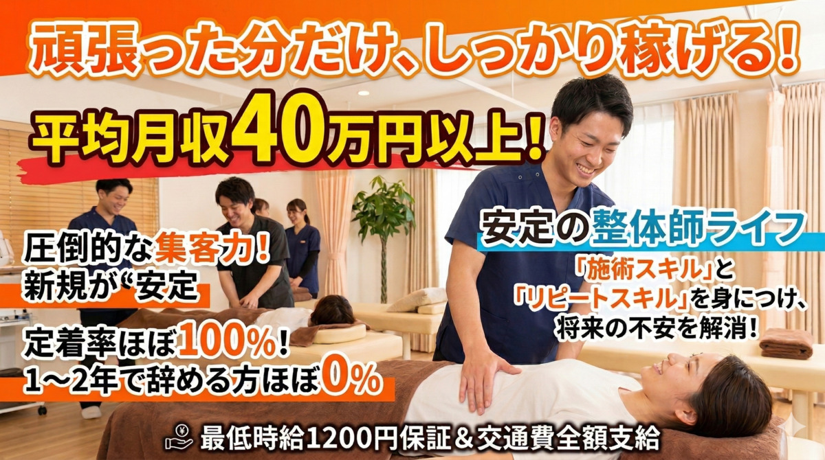 「店長にならないと稼げない…」と諦めていませんか? **完全週休2日でスタッフ平均月40万円以上。特定の人だけでなく“平均”が高いからこそ安定。**人間関係も良く、長く続けるスタッフが多い整体院です。