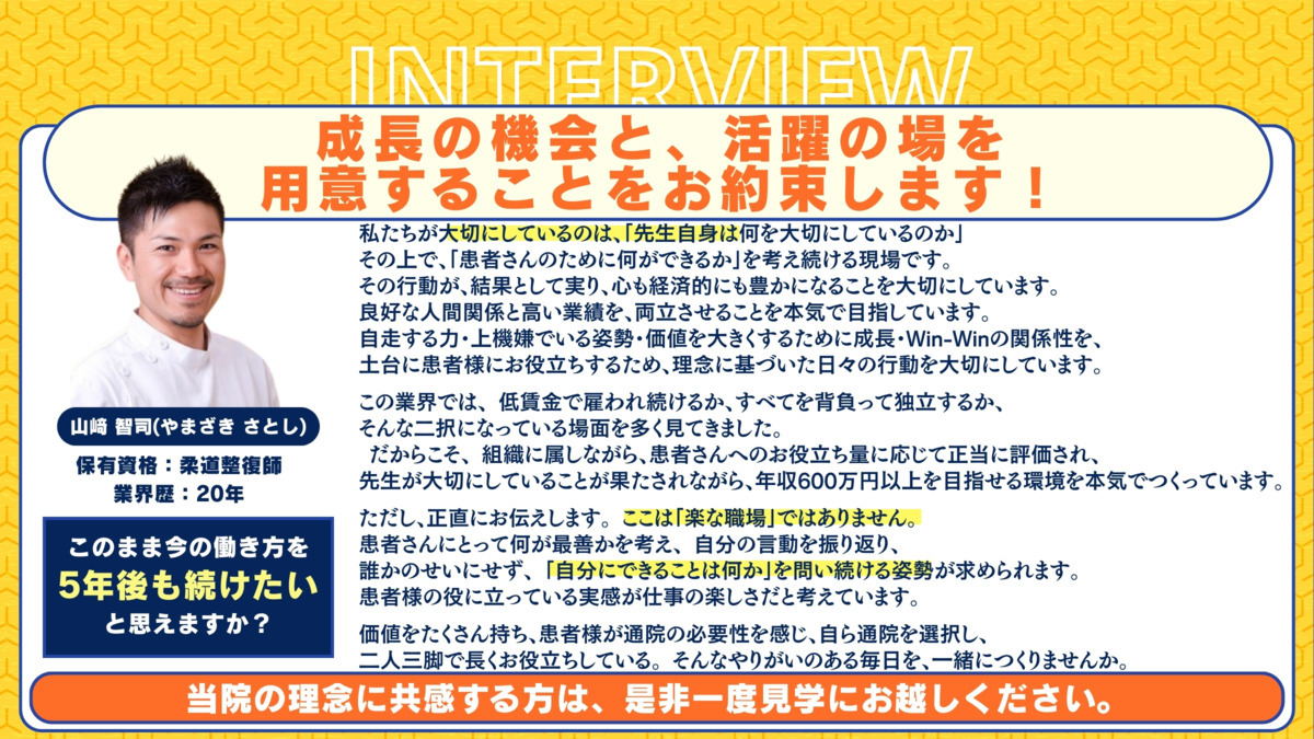 今回は患者さまを笑顔にする整体師を募集しています。整体師の資格の有無は問いません。人の話をじっくりと聞ける方、コミュニケーションを大切にできる方にぜひご活躍いただきたいです。