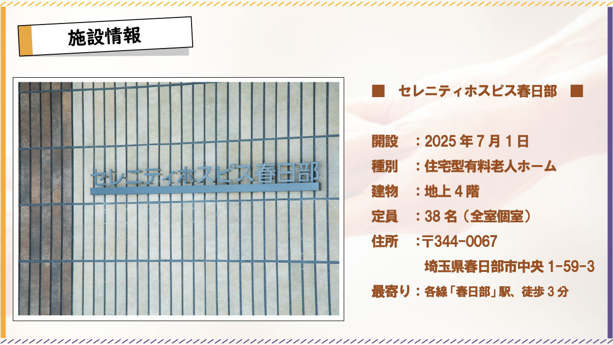 2025年7月1日、埼玉県春日部市に医療特化型の住宅型有料老人ホーム「セレニティホスピス春日部」がオープン!!