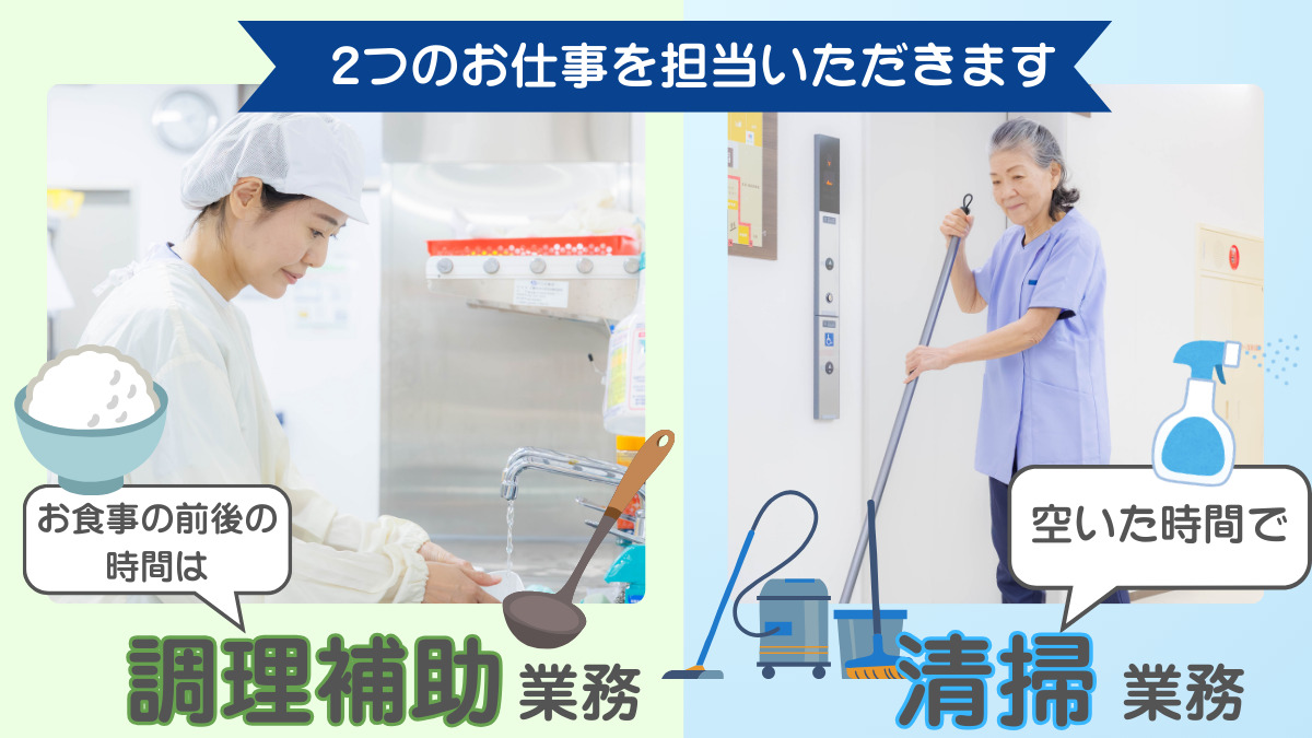 ご入居者様の生活の場を整えるお仕事です。 決まった時間での調理補助業務と、 空いた時間での清掃業務をお願いします。 ◆調理補助 ・・・・・・・・・・ 入居者様の食事準備・片付けをしていただきます。 ⏩具体的には 届いた食材を ・スチームの機械で温める ・刻む ・とろみをつける ・盛り付ける等の作業 また、出来上がったお料理の ・配膳 ・下膳 をお任せします。 ※火加減を見て煮る・焼くといった調理はございません!  ̄ ̄ ̄ ̄ ̄ ̄ ̄ ̄ ̄ ̄ ̄ ̄ ̄ ̄ ̄ ̄ ̄ ̄ ̄ ̄ ̄ ̄ ̄ ̄ ̄ ̄ ※空調の効いた施設内厨房でのお仕事です  ̄ ̄ ̄ ̄ ̄ ̄ ̄ ̄ ̄ ̄ ̄ ̄ ̄ ̄ ̄ ̄ ̄ ̄ ̄ ̄ ◆ 清掃 ・・・・・・・・・・ 施設内共有スペースや、居室、浴室、お手洗い等の清掃をお願いします。 シーツ交換や洗濯の業務が含まれる場合もあります。 ※業務変更範囲:会社の定める業務内容