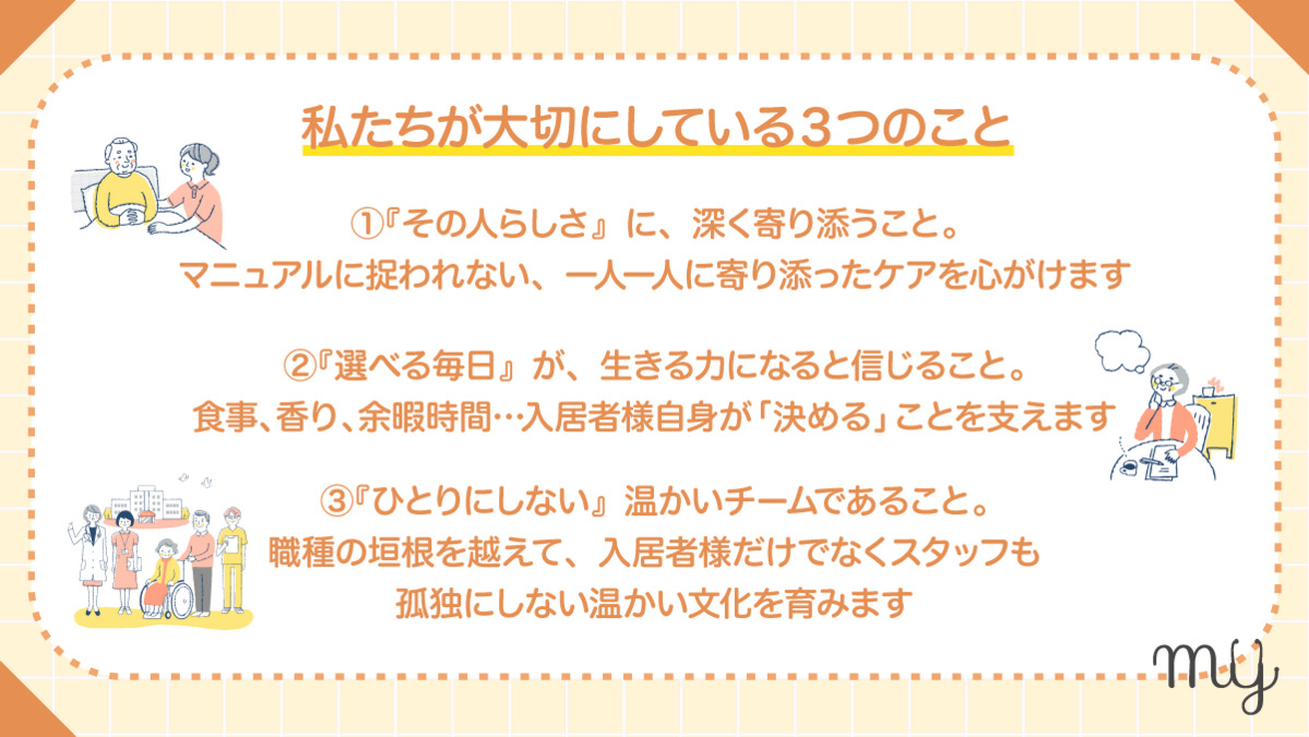 私たちは「一人で抱え込まないケア」を大切にし、チーム全体で支え合う風土があります。また、スタッフの意見を積極的に取り入れる文化が根付いており、風通しの良さも特徴です。