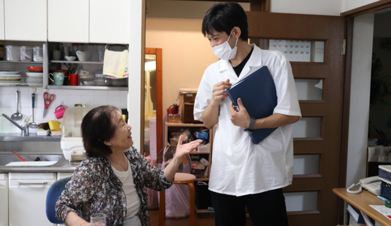 退院した利用者さんのお宅にて今後の生活に必要なサービスを確認。訪問診療の医師や福祉用具会社、デイサービスの担当者が集まり打ち合わせ。