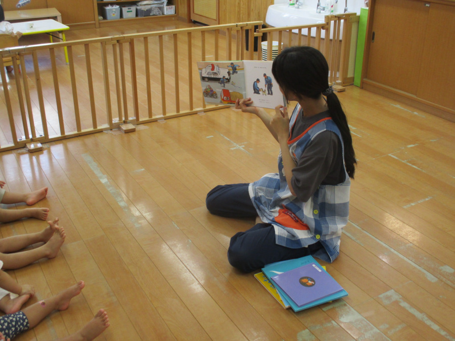 着替えて、申し送り事項の確認してから、子どもたちの登園準備をします。 順次登園してきた子どもの受入れ あいさつ、体調の確認 自由あそび、ふれあいあそび 「今日も一日がんばるぞ!」