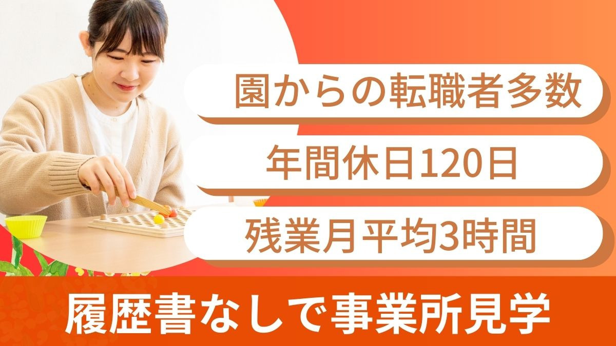 保育所からの転職者多数! / 発達分野未経験・ブランクありOK / こども一人ひとりと向き合える / 完全週休二日制 / 社会保険完備 / 交通費全額支給 / 持ち帰り仕事なし / 年間休日120日以上