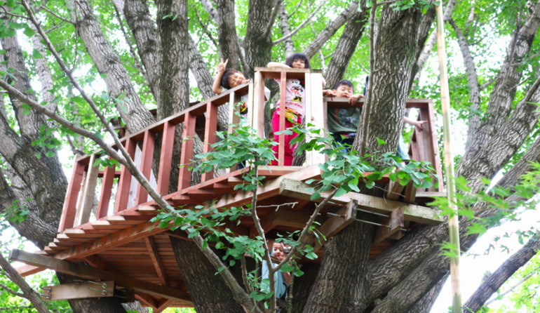 - 赤城南麓の自然豊かな環境に位置し、ツリーハウスや巨大ハンモック、谷渡りターザンなど多彩な遊び場が子どもたちの挑戦意欲を刺激します。