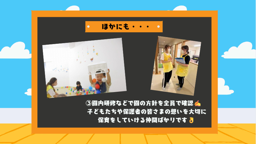 定員19名の小規模保育園でのお仕事です。 保育士業務全般をお任せいたします。 0歳児~2歳児までをお預かりしています。 家庭的な保育をもとに、モンテッソーリ教育を始めとしながら、 リトミックや体操などお子さま一人ひとりの個性と自主性を 無理なく伸ばしていけるよう、多彩なプログラムを取り入れております。 #園近くの公園充実◎ お決まりのお散歩コースがあり 保育者も四季を感じる日常を送ることができます☆ #食育活動も重視! 苗植えをして夏野菜を育てるなど 給食室のスタッフと連携し進めています◎ #園内研修などで園の方針を全員で確認。 子どもたちや保護者の皆さまの想いを大切に 保育をしていける仲間ばかりです♪