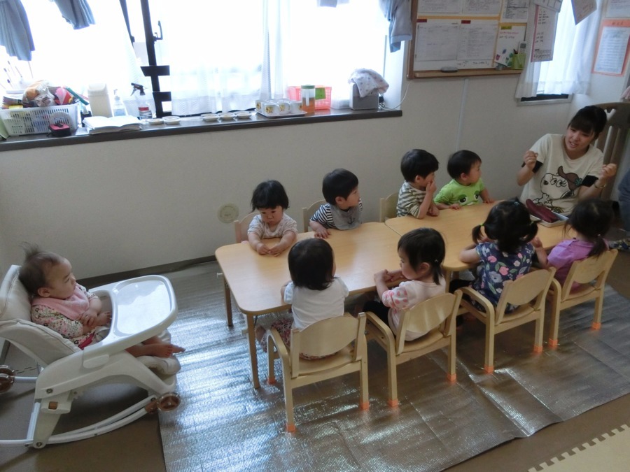 - 1~2歳児の小規模な保育室。9名の子ども達を、保育士3名でみまもる保育。