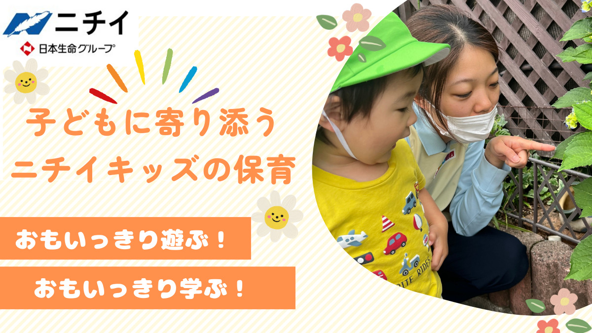 ニチイキッズ保育園の保育理念、は「おもいっきり遊ぶ。おもいっきり学ぶ。」です。先生たち一人ひとりの保育への思いを大切に、自分のやりたい保育を、「おもいっきり」できる環境を整えています。子どもたちと一緒に笑顔で輝いているスタッフのお仲間になって頂ける人を募集しています。 ◇求める人物像 明るく、協調性のある方!PC、ピアノ、制作が苦手でも、挑戦する姿勢のある方を歓迎しています。 ◇面接は1回 園長先生と採用者と応募者で面接をします。 応募者の方が緊張しないよう、笑いあり、和やかな雰囲気で進みます。 ◇職場環境 保育に集中できるよう、ICTなどを導入・活用することで書類作成といった作業量をできる限り減らし、持ち帰り仕事はありません。休日は完全週休2日制なので、有休取得も積極的に進めています。プライベートでリフレッシュしてこそ仕事でも頑張れると考えていますので、そのための環境整備には会社も力を入れています。 園の雰囲気を直接感じてみると、働きたいと思ってもらえると思います! まずは気軽に園見学にお越しください。(採用担当 加藤)