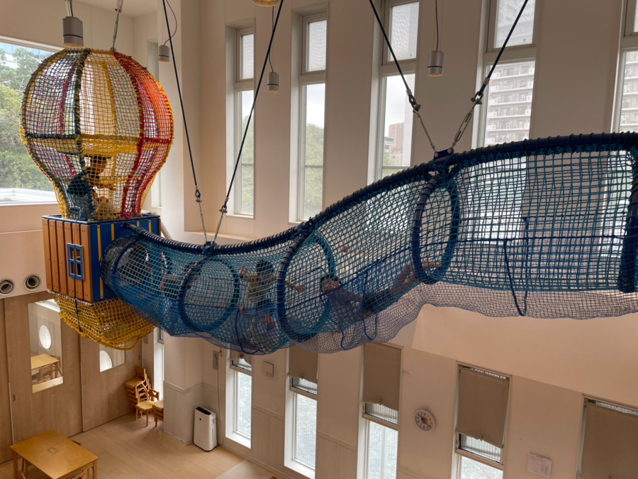 「西大井駅」より徒歩4分で通勤便利!隣接する広場公園とは別に敷地内にも園庭があります。また、廊下から幼児クラスの頭上に広がる室内遊具では体の使い方や体幹が鍛えられ、子どもたちからも大人気。保育にはコーナー保育やstem教育を取り入れているほか、体操活動やリズム活動など多様な活動があります。充実の研修制度