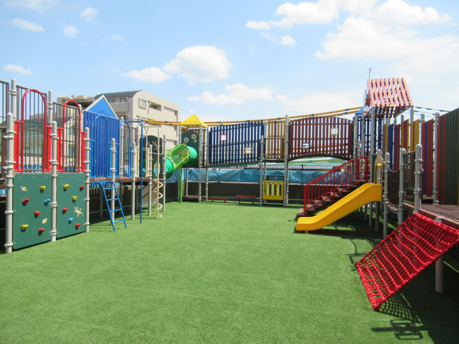 1階には砂場が、1階から2階にかけてはネット遊具が広がり、屋上一面に滑り台や、クライミング、登り棒等があります。また、屋上から2階に下りられる、ぐるぐる滑り台も子どもたちに大人気!外部講師による体操教室に加え、毎日の体操・柔軟、晴れている日は1日2回外遊びを行ったりと様々な活動があります。充実の研修制度