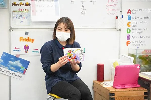 外国人スタッフとペアを組み、 2人担任制で1クラスの担任をする体制です。