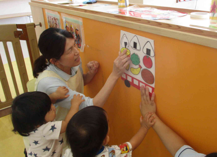 子どもたちと一緒に朝のあいさつ。 朝の会、出席確認 手遊びや季節の歌を歌いながら、子どもたちの健康チェック。 おやつもみんなで仲良く食べます。