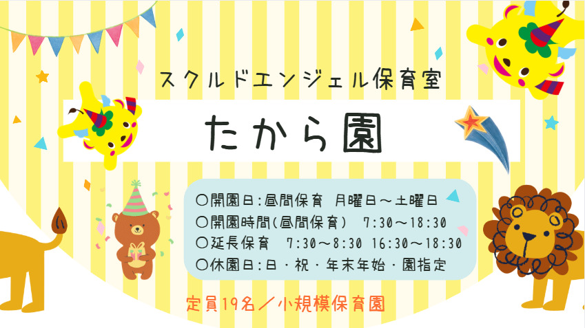 【業務内容】 定員19名の小規模保育室でのお仕事です。 0歳~2歳児の保育業務全般をお任せいたします。 少人数だからこそ出来る、一人ひとりの個性を大切に、 安心・安全で愛情たっぷりの保育を目指します。! ★たから園の魅力ポイント ・持ち帰り禁止・残業はほぼ無し! ・園長や職員同士の距離も近く相談しやすい! ・フォロー体制も◎ 聞きやすく学べる環境経験が浅くても安心♪ 頼れる職員さんたちがあなたをフォローします! ・働く保育士さんのための充実した福利厚生 ・園全体でホワイトボーや連絡ノートを駆使し 情報や引継ぎ内容が皆に行きつくように 運営しております!