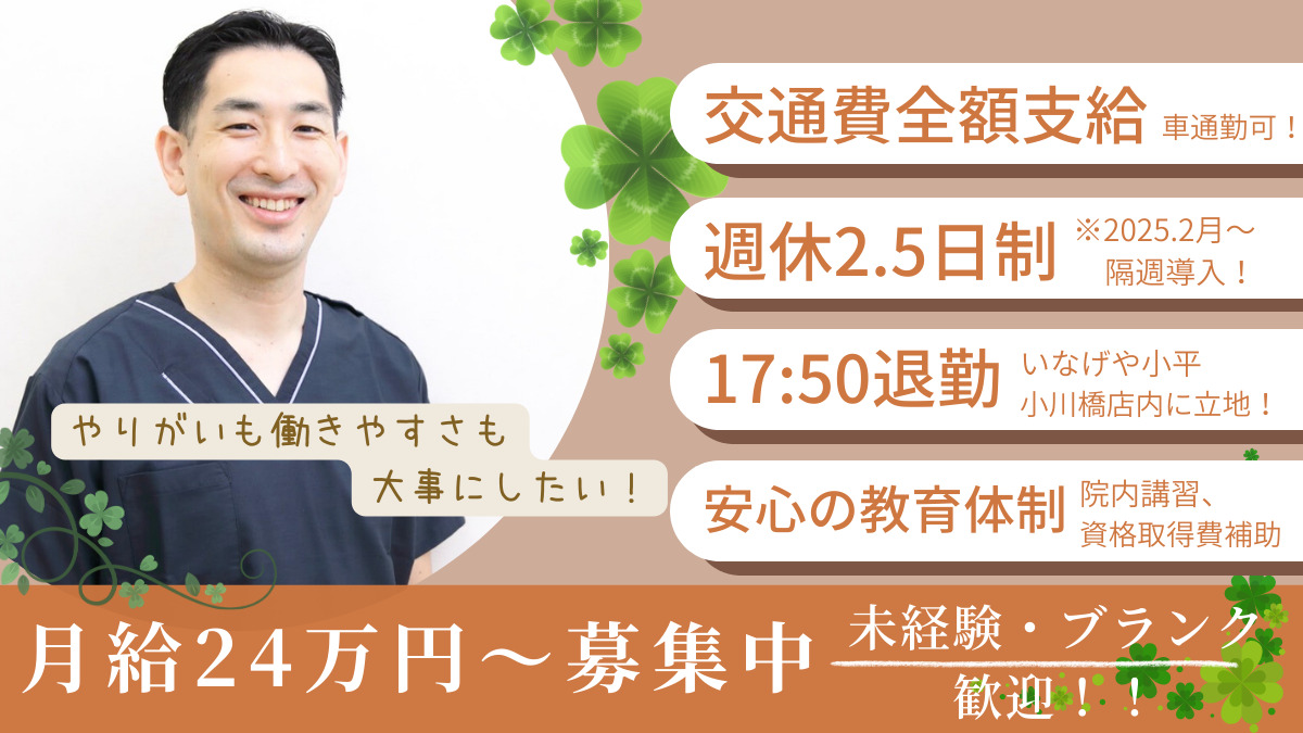 平日8時半~13時、14時20分~17時50分(休憩80分) 土曜日8時半~13時、13時50分から17時20分(休憩50分) ※残業はほぼありません。 ※第二第四の水曜日の午後14時~18時の矯正日はそのままです! 終業時間は平日17時50分です! 土曜日は17時20分終業です!!! 【⚠️4月1日から診療時間が短くなります!】 平日:8時半から17時半まで 土曜日:変更なし 昼休憩60分
