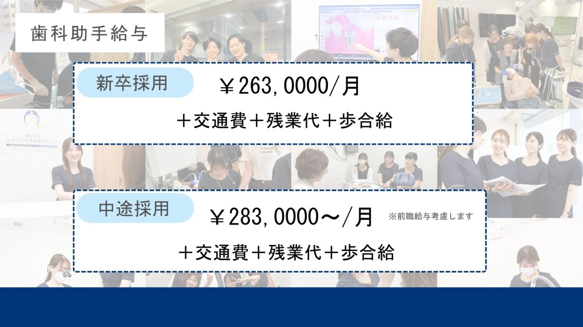 試用期間3か月(給与の変動なし) 歩合あり(ホワイトニング、コンサル等) 残業代(1分単位) 交通費 全額支給 随時昇給あり 賞与あり(夏冬) ※試用期間3ヶ月(期間中の条件変更なし) 年15日祝日振替取得制度あり(週5勤務の場合)