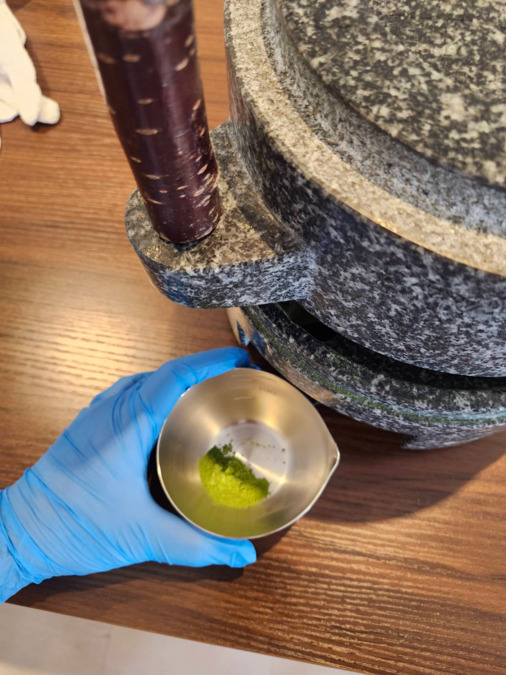 「滋賀県産の碾茶(緑茶)を使用した石臼挽き抹茶づくり」