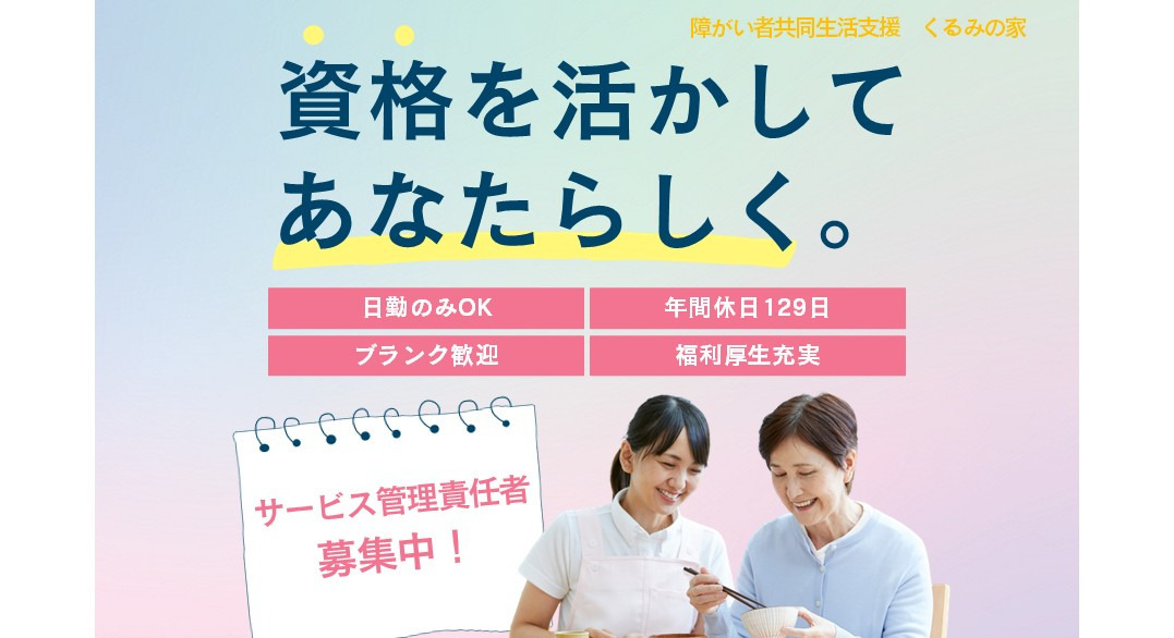 【必須】 サービス管理責任者研修修了者、または修了予定の方 【歓迎】 障がい福祉分野での実務経験をお持ちの方(経験年数不問) 普通自動車運転免許(AT限定可)あれば尚可