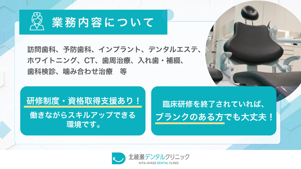 -衛生管理を徹底しており、患者様はもちろんスタッフの健康も守っています。 #スキルアップできる職場です -一般診療、自由診療をおこなっており、さまざまな症例に携わることができます。 -Drは5名常駐しており、うち1名は矯正治療を専門としています。認定医のいる環境をお探しの方にも適しています。 -院内研修制度に加えて、院外のセミナー費用補助も実施しているので、新しい知識を吸収できます。 -分からないことは指導しますので、未経験者もご安心ください。もちろん経験者は優遇します。