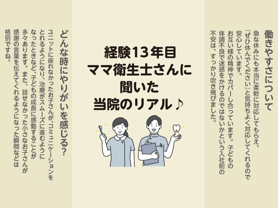 小児専門だからこそ、一人ひとりを焦らずサポートできる環境です。認定歯科衛生士取得のサポートもあり、無理なくスキルアップも可能。