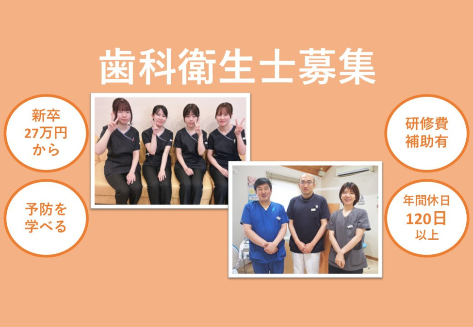 歯科衛生士業務 *予防を中心とした歯周治療がメイン *担当衛生士制で初診からメンテナンスまで患者さんと向き合っていける為とてもやりがいがあります *メンテ45~60分枠 *受付業務なし *Asほぼなし(はじめは当院の治療の流れを知って頂く為As期間あり) ふじい歯科では予防に力を入れて取り組んでいます。 未経験やブランクのある方も育成マニュアルに沿って、先輩が優しく指導してくれるので安心して働けます。 歯科衛生士としてスキルを身につけられる環境です♪