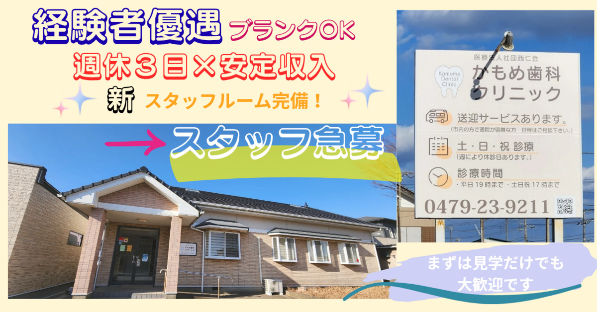 ゆとりの週休3日です!(水土 他1日) ※第2.3,4週は土曜診療 (口腔外科診療日)※3週は日曜も診療あり ※週休2日でしっかり稼ぎたい方も大歓迎です。 ※時短勤務については相談可
