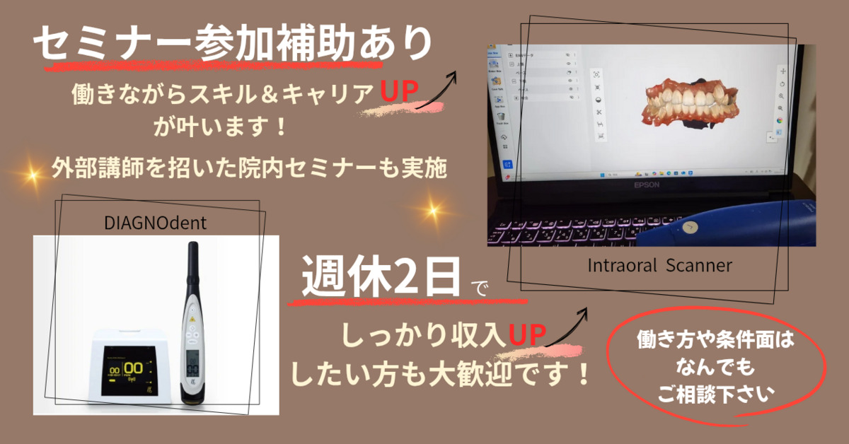 最新の知識技術習得に向上心のある方、器具の準備や患者さんの導入、スタッフ欠員時に受付業務などしてくださる方は特に優遇致します。