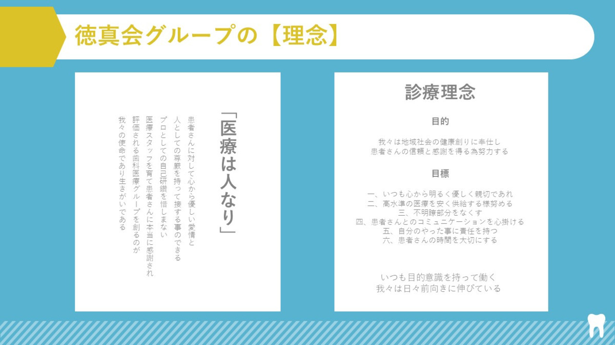 創業45年、スタッフ1400人、年間約70万人の患者さまの治療に携わる世界最大級の歯科医療グループです。診療部門・歯科技工部門・マネジメント部門・保育部門・清掃部門が連携してチーム医療を実現しています。歯科助手から始めて徳真会奨学金をもらい歯科衛生士になったスタッフや、入社後に各種資格を取得したスタッフなど、頑張る皆さまを応援しています。