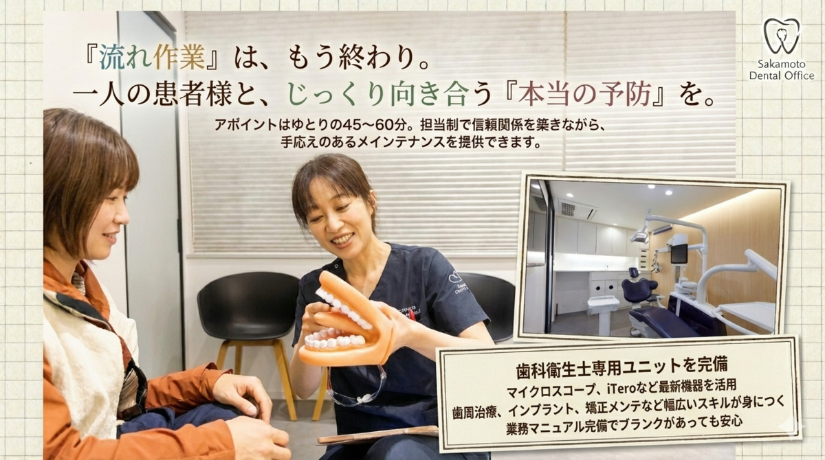 🦷 1人45~60分。流れ作業ではない「本当の予防」 坂本歯科医院では、衛生士さんが主役となって活躍できる環境を整えています。 【 担当制によるメインテナンス 】 ・ ゆとりのアポイント: 1人45分~60分 ・ 業務内容: メインテナンス業務、患者管理、カルテ記入、レセプト入力 ・ 最新設備: 専用ユニット、iTero、セレック、拡大鏡、マイクロ完備 【 得られるスキル 】 ・ 一生モノの技術: インプラント・矯正(ワイヤー等)のメインテナンス ・ ハイクオリティ: 歯周治療の最先端知識を学べる教育カリキュラム ・ その他: 予防歯科、ホワイトニング、インプラント、歯周治療、入れ歯・補綴、Dr.のアシスタント業務、見積書作成など