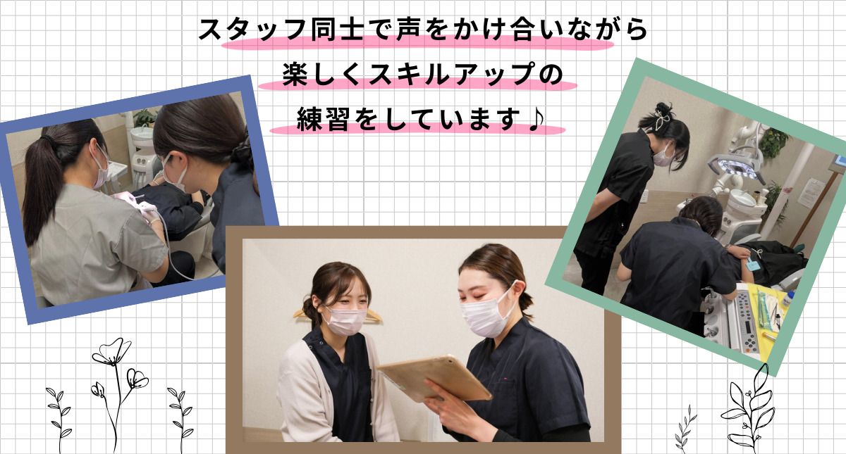 はじめは見学からスタートし、業務に慣れ次第、少しずつ診療をお任せしていきます。スタッフ同士の仲も良く、分からないことは気軽に質問できる環境です🗣️♡