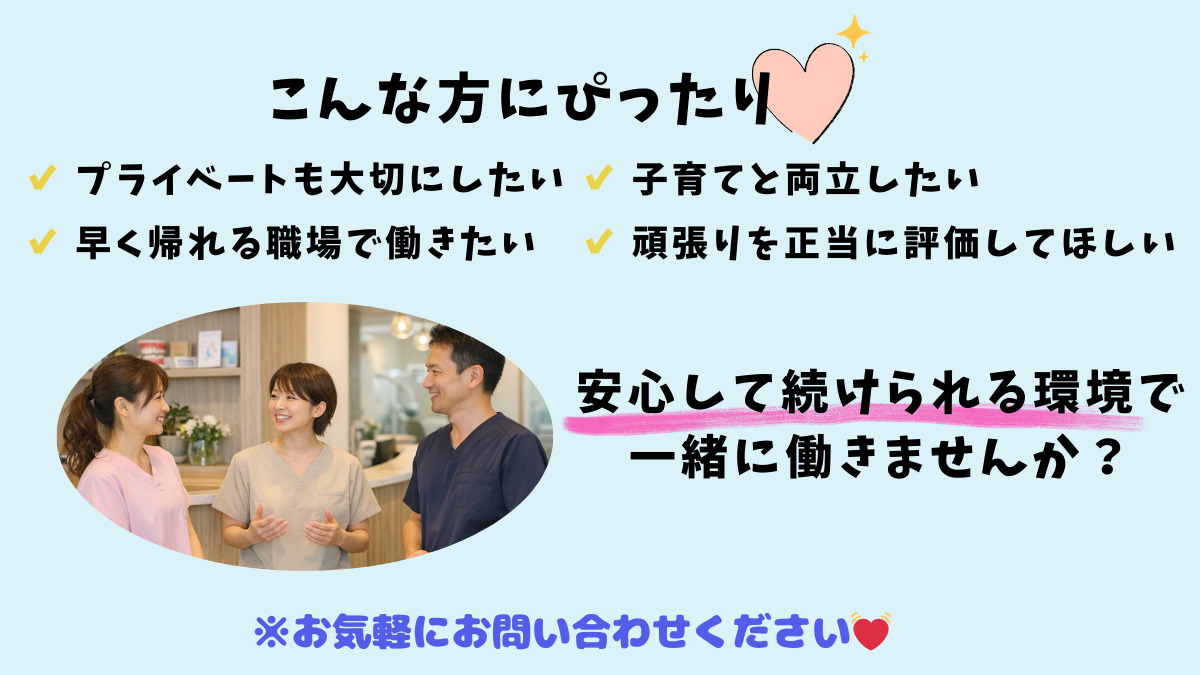 木日祝休み♪各種手当充実◎昇給・賞与あり☆地域に密着した歯科クリニックでゆとりとやりがいを持って働きませんか?