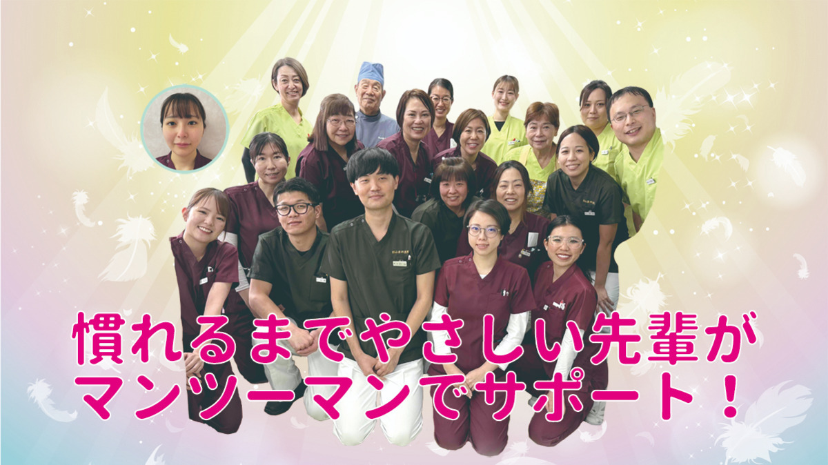 歯科医師4名先輩衛生士9名歯科助手1名が忙しい中でも仲良く楽しく働く職場です。 臨床研修及び、臨床実習施設として認定されており、未来の歯科医師・歯科衛生士の教育の応援をしています。 現在は研修医の歯科医師2名のほか、定期的に歯科衛生士学校の臨床実習の生徒さんが見学や実習に来ています。 研修・実習施設としての経験から、新しく仲間になった方へのサポートは万全の体制をとっています。 見学や面接のご応募はもちろん、ご質問なども随時受け付けておりますので、遠慮なくご連絡ください。