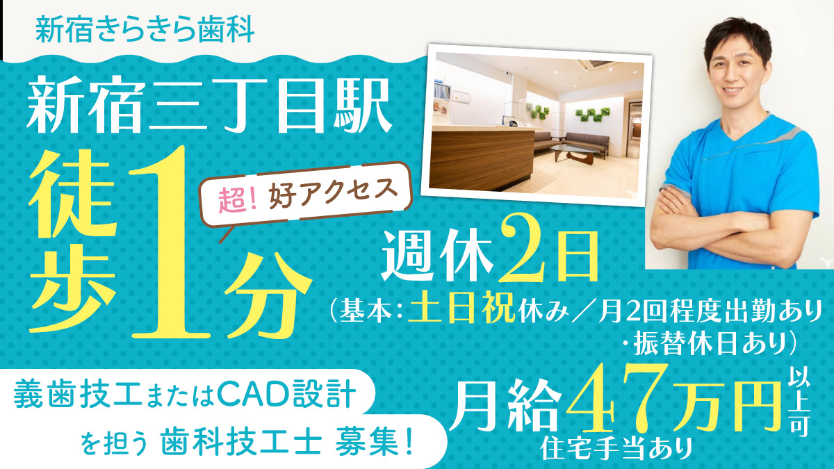 <新宿三丁目駅徒歩1分>月給47万円以上可・住宅手当あり★週休2日(基本:土日祝休み)×残業ほぼナシ★義歯技工またはCAD設計を担う歯科技工士募集★即戦力として活躍いただきたいです!